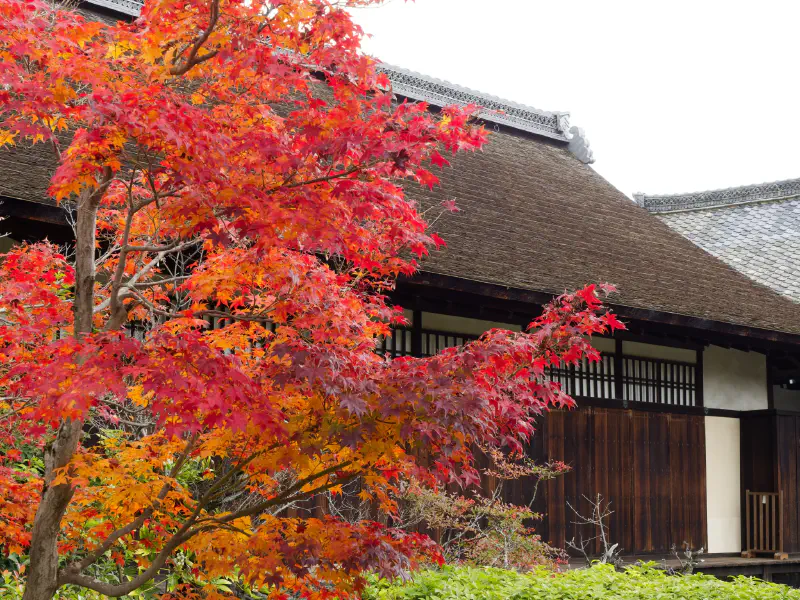 書院。こけら葺きの落ち着いた色合いと、紅葉の強い赤とのコントラストが際立ちます。