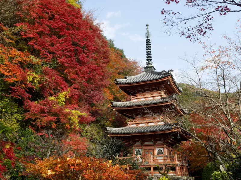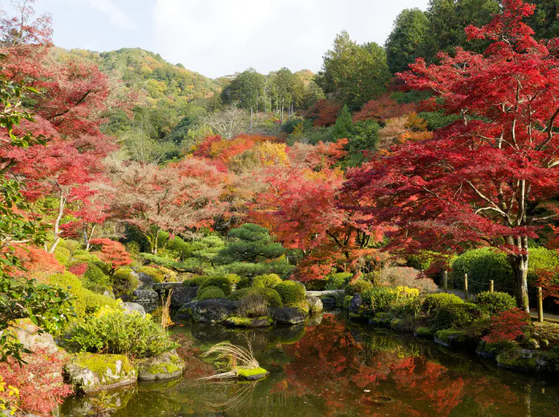 池に反射する紅葉、山並みとのコントラストの美しさ、お堂との組み合わせ…