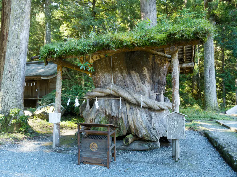 こちらは樹齢千年余りと伝わる御神木の大杉。過去の台風で倒れてしまったそうですが、幹の太さがその大きさを物語っています。