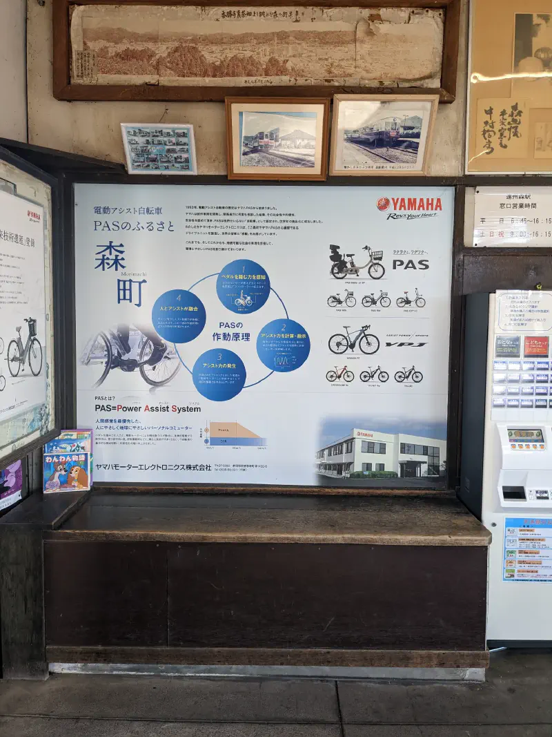 遠州森駅の待合室には、電動自転車のポスターが。世界初の電動アシスト自転車 PAS のふるさとだそうです。